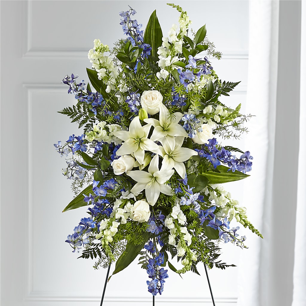 A collection of bold blue flowers shares a tribute that words cannot express. Designed with lilies, roses, delphinium and snapdragons our Faithful Friend Standing Spray is a grand gesture to express kindness and solace to a loved one.