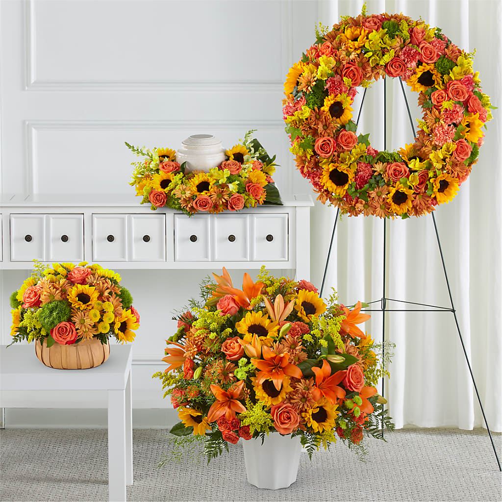 The Premium Bundle includes our Harvest Sunflower Basket, Harvest Thoughts Floor Basket, Autumnal Memories Wreath, and Faithful Sunflower Cremation Adornment.